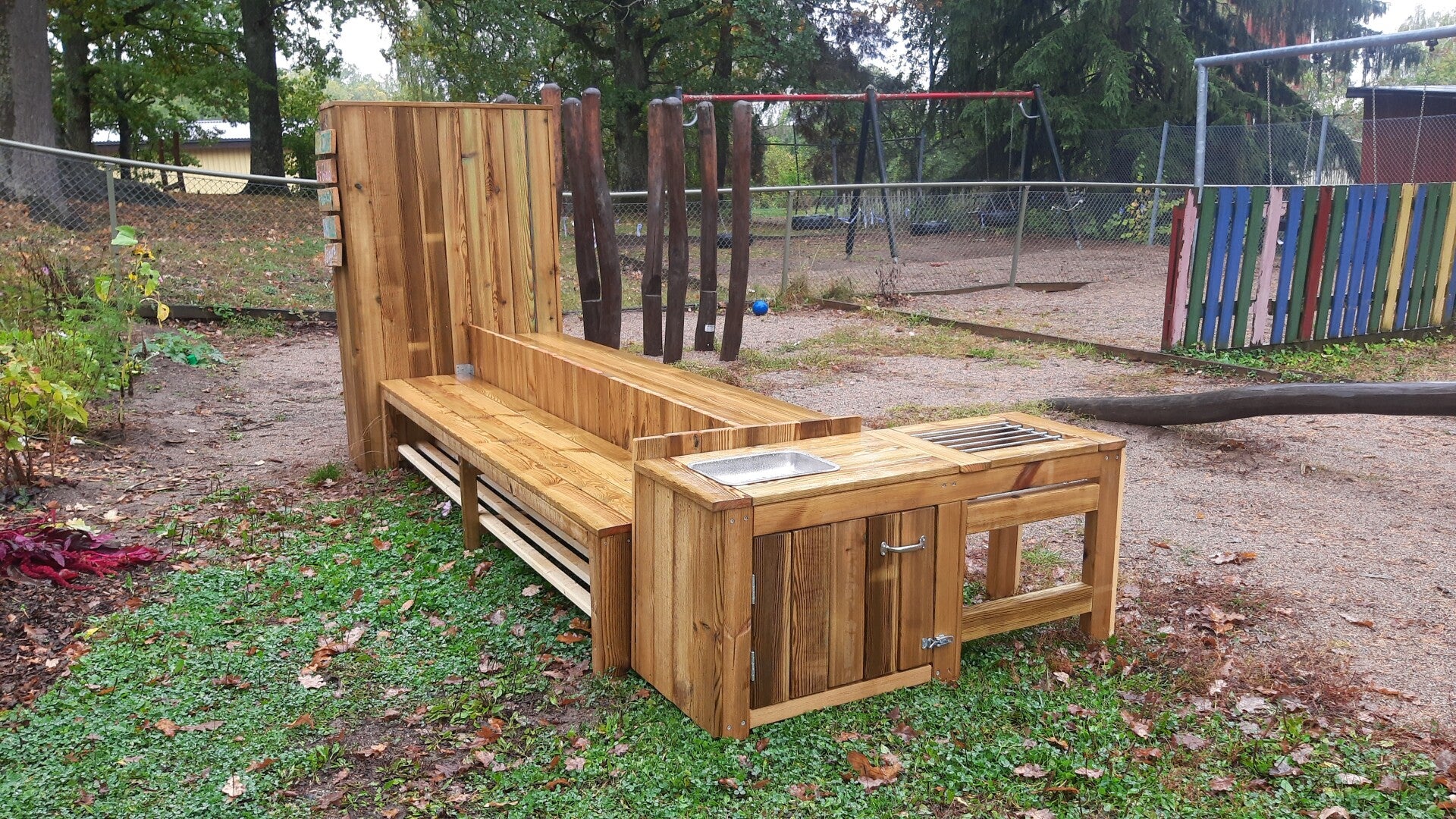 För att underlätta aktiviteter med odling tillsammans med barnen så beställde vi en arbetsbänk med plats för både stora och små barn. Där finns det också plats i skåpet för redskap, handskar och jord - lättillgängligt på plats.